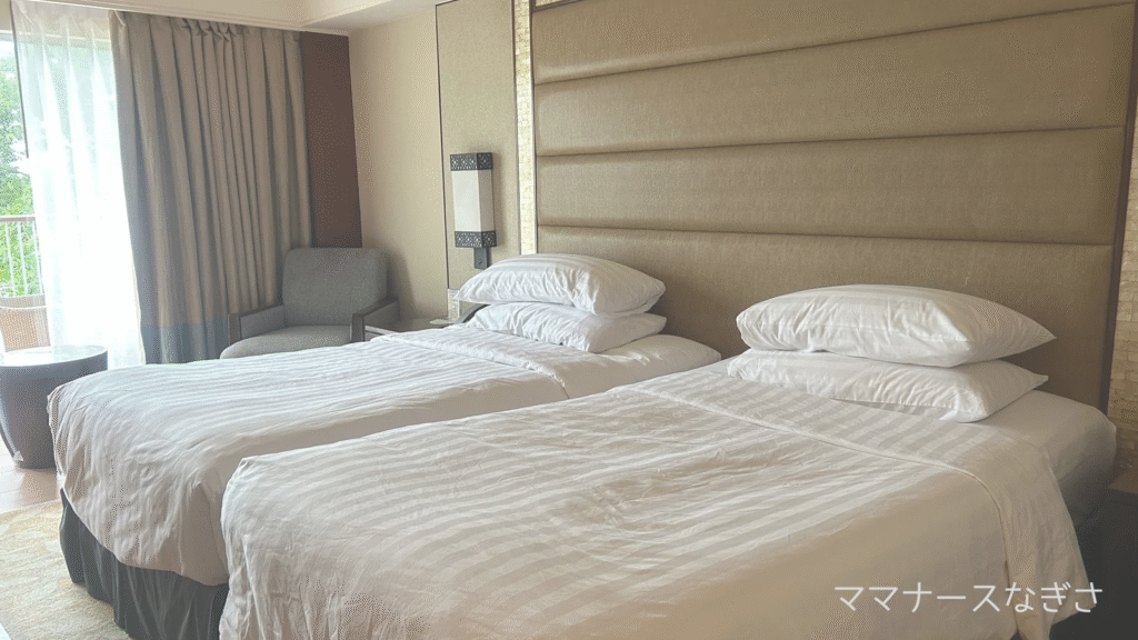 ベッドはダブルサイズが2つ。大人二人の料金で、小学生1人、乳児1人が泊まれたのはとても良かったです。