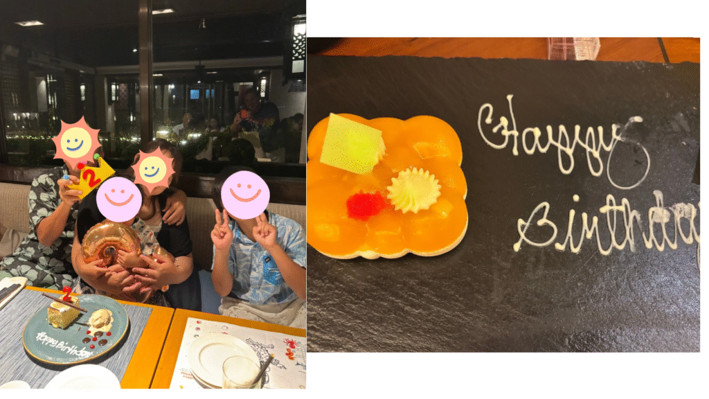 滞在中に、2歳お誕生日を迎えた次男。なんと当日に、部屋に風船とケーキ、メッセージカードを持って来ていただきました。風船に大喜びの次男。その心遣いにとても感動しました。また別の日にホテルのレストランでケーキに持参したろうそくをお願いしたところ、現地のハッピーバースデーソングを従業員の方みんなで歌っていただき思い出に残るお誕生日になりました。